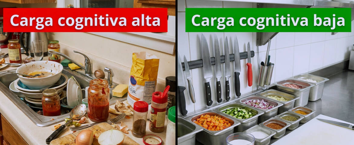 Una cocina doméstica desordenada obliga a buscar cada utensilio, adivinar la ubicación de los ingredientes y resolver obstáculos logísticos en cada paso. Aunque el resultado —preparar una comida— pueda lograrse, la experiencia se ve interrumpida por múltiples decisiones triviales que agotan la atención.