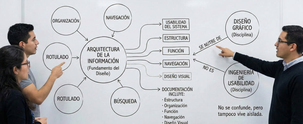Aquí hay un matiz importante: el mismo texto también aclara que la Arq. Info. no es diseño gráfico ni ingeniería de usabilidad como campos disciplinarios independientes, sino que se nutre de ellos para conformar una metodología.